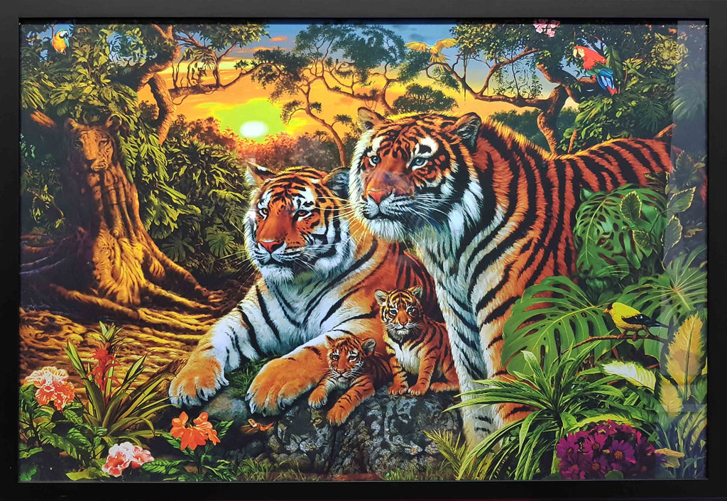 This is a Pre-Framed Print ready to hang with glass and string. See if you can find the 16 tigers.
